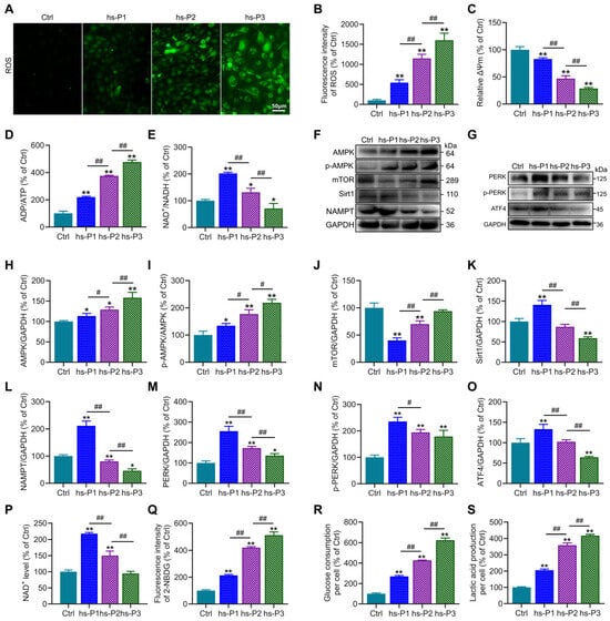 To further investigate the mechanisms underlying hyperosmotic stress-induced senescence in HCEPCs, we first assessed ROS levels in HCEPCs subjected to hyperosmotic stress across hs-P1-3. Results demonstrated a significant, passage-dependent increase in ROS levels in hs-P1 to hs-P3 HCEPCs compared to Ctrl group (Figure 3A,B), suggesting that hyperosmotic stress-induced senescence may be associated with oxidative stress. To investigate the intracellular source of ROS, mitochondrial membrane potential (ΔΨm) was evaluated using JC-1 staining. This analysis revealed a progressive decline in ΔΨm with successive passages under hyperosmotic stress (Figure 3C and Figure S1), demonstrating that loss of ΔΨm and disruption of the electron transport chain constitute a significant source of elevated intracellular ROS. Mitochondrial dysfunction is frequently accompanied by impaired aerobic respiration and cellular energy deficits [32]. Consistent with this conjecture, we observed a progressive increase in the ADP/ATP ratio (Figure 3D) and a sustained decline in the NAD+/NADH ratio following an initial peak in hs-P1 (Figure 3E). Concomitant with rising ADP levels in hyperosmotic stress-treated HCEPCs, the expression of p-AMPK and total AMPK—key energy-sensing and metabolic regulatory kinases—was significantly elevated (Figure 3F,H,I). This was accompanied by a pronounced and sustained increase in cellular glucose uptake (Figure 3Q), glucose consumption (Figure 3R), and lactic acid production (Figure 3S). Furthermore, analysis of AMPK downstream effectors revealed that mTOR expression was significantly reduced in hs-P1 but subsequently increased (Figure 3J). Protein levels of Sirt1 and NAMPT (Figure 3K,L), along with cellular NAD+ levels (Figure 3P), peaked in hs-P1 and subsequently declined. In parallel, Western blot analysis showed that protein levels of PERK, p-PERK, and ATF4 were markedly increased in hs-P1 but progressively decreased thereafter (Figure 3G,M–O), indicating that heightened intracellular ROS triggered endoplasmic reticulum (ER) stress and the UPR [33]. Collectively, these findings outline a mechanistic cascade in which hyperosmotic stress triggers oxidative stress in HCEPCs, resulting in the decrease in mitochondrial membrane potential. This mitochondrial dysfunction further drives excessive production of ROS, thereby amplifying the initial oxidative stress. This, on one hand, disrupts cellular energy homeostasis, activating the AMPK/mTOR/NAMPT/Sirt1 signaling axis and triggering an energy stress response. On the other hand, it induces ER stress, activating the PERK/ATF4 signaling pathway and eliciting the UPR [34].