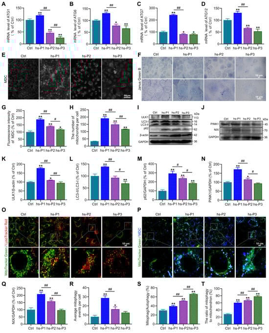 Hyperosmotic stress activates autophagy and mitophagy in HCEPCs to counterbalance cellular homeostasis. (A–D) Detection and statistical analysis of mRNA expression levels of ATF4 target genes ATG1, ATG6, ATG7, and ATG12 in hypertonic-stressed HCEPCs. (E) Fluorescent images of MDC staining in hypertonic-stressed HCEPCs of different passages. (F) Images of Janus green B staining in hypertonic-stressed HCEPCs of different passages. (G) Statistical analysis of MDC staining in (G). (H) Statistical analysis of mitochondrial numbers in (F). (I) Western blot images of ULK1, LC3 and p62 in hypertonic-stressed HCEPCs of different passages. (J) Western blot images of PINK and NIX in hypertonic-stressed HCEPCs of different passages. (K–M) Optical density analysis of ULK1, LC3 and p62 immunoblots in (I). (N,Q) Optical density analysis of PINK and NIX immunoblots in (J). (O) Co-localization fluorescence images of MitoTracker Green/LysoTracker Red in hypertonic-stressed HCEPCs of different passages. Representative micrographs display mitochondria (green) and lysosomes (red). (P) Co-localization fluorescence images of MitoTracker Green/MDC in hypertonic-stressed HCEPCs of different passages. Representative micrographs display mitochondria (green) and autophagosomes (blue). (R) Statistical analysis of mitochondrial autophagy-positive points in (O). (S) Statistical analysis of the proportion of mitochondrial autophagy to total autophagy in (P). (T) Statistical analysis of the proportion of autophagic mitochondria to total mitochondria in (P). hs-P denotes the number of successive passages under 400 mOsm/L hyperosmotic medium. Data are expressed as mean ± SEM (n = 3). * p < 0.05, ** p < 0.01 vs. blank controls (Ctrl), and # p < 0.01, ## p < 0.01 among different experimental groups.