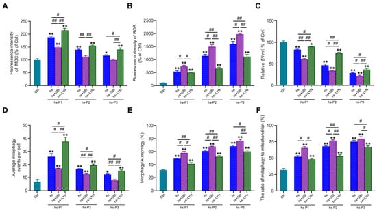 Activation of autophagy in response to hyperosmotic stress enhances mitophagic activity and ameliorates oxidative stress in HCEPCs. (A) Statistical analysis of MDC staining in hyperosmotic-stressed HCEPCs after treatment with autophagy inhibitors/activators.in Figure S2A. (B) Statistical analysis of ROS levels in hyperosmotic-stressed HCEPCs after treatment with autophagy inhibitors/activators.in Figure S2B. (C) Statistical analysis of mitochondrial membrane potential in hyperosmotic-stressed HCEPCs after treatment with autophagy inhibitors/activators. (D) Statistical analysis of mitochondrial autophagy-positive points in hyperosmotic-stressed HCEPCs after treatment with autophagy inhibitors/activators in Figure S2C. (E) Statistical analysis of the proportion of mitochondrial autophagy to total autophagy in hyperosmotic-stressed HCEPCs after treatment with autophagy inhibitors/activators in Figure S2D. (F) Statistical analysis of the proportion of autophagic mitochondria to total mitochondria in hyperosmotic-stressed HCEPCs after treatment with autophagy inhibitors/activators in Figure S2D. P denotes the number of successive passages. Data are expressed as mean ± SEM (n = 3). * p < 0.05, ** p < 0.01 vs. blank controls (Ctrl), and # p < 0.01, ## p < 0.01 among different experimental groups.