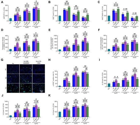 Autophagy activation alleviates energy crisis, DNA damage, and inflammatory response in hyperosmotic-stressed HCEPCs. (A) Detection of ATP/ADP levels in hypertonic-stressed HCEPCs after treatment with autophagy inhibitors/activators. (B) Detection of NAD+ levels in hypertonic-stressed HCEPCs after treatment with autophagy inhibitors/activators. (C) Detection of the NAD+/NADH ratio in hyperosmotic-stressed HCEPCs after treatment with autophagy inhibitors/activators. (D) Detection of cellular glucose uptake levels in hyperosmotic-stressed HCEPCs after treatment with autophagy inhibitors/activators. (E) Detection of glucose consumption levels in hyperosmotic-stressed HCEPCs after treatment with autophagy inhibitors/activators. (F) Detection of lactic acid production levels in HCEPCs subjected to hyperosmolar stress after treatment with autophagy inhibitors/activators. (G,H) Immunofluorescence staining images and statistical analysis of γ-H2AX in hyperosmotic-stressed HCEPCs treated with autophagy inhibitors/activators. Representative micrographs display γ-H2AX -positive cells (green) and total cells (blue). (I–K) Detection of IL-1β, IL-6, and IL-8 secretion levels in hyperosmotic-stressed HCEPCs treated with autophagy inhibitors/activators. P denotes the number of successive passages. Data are expressed as mean ± SEM (n = 3). * p < 0.05, ** p < 0.01 vs. blank controls (Ctrl), and # p < 0.01, ## p < 0.01 among different experimental groups.