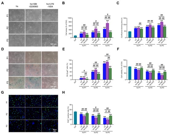 The experiment was designed as follows: (i) hyperosmotic medium (400 mOsm/L) was prepared by supplementing DMEM-F12 culture (312 mOsm/L) with an additional 2.92 g/L of NaCl, and its osmolarity was measured and confirmed using a molarity os-mometer (SMC 30DS, Tianhe, Tianjin, China); (ii) the HCEPCs from a the non-transfected HCEP cell line were trypsinized, resuspended in hyperosmotic medium, seeded into cell culture plates or flasks, collected as the cell confluent monolayer formed and divided into 2 parts: one was cultured in the normal 10% FBS-DMEM/F12 for 24 h allowing stress re-covery before senescence assessment and designated as the first hyperosmotic passage (hs-P1), the other was cultured in the hyperosmotic media for successive induction of se-nescence as hs-P2 or hs-P3; (iii) to explore the role of autophagy in modulating HCEPC senescence, we prepared the autophagy inhibitor SBI-0206965 (5 μM; HY-16966, Med-Chemexpress, Monmouth Junction, NJ, USA) [23] or activator LYN-1604 (2 μM; HY-101923 MedChemexpress, NJ, USA) [24]; (iv) the inhibitor or activator was applied simultaneously with hyperos-motic stress induction and maintained continuously throughout the experimental dura-tion, generating treatment groups designated as hs + SBI-0206965 and hs + LYN-1604; (v) correspondingly, the HCEPCs cultured in the DMEM-F12 without hyperosmotic stress was used as the control group (Ctrl).