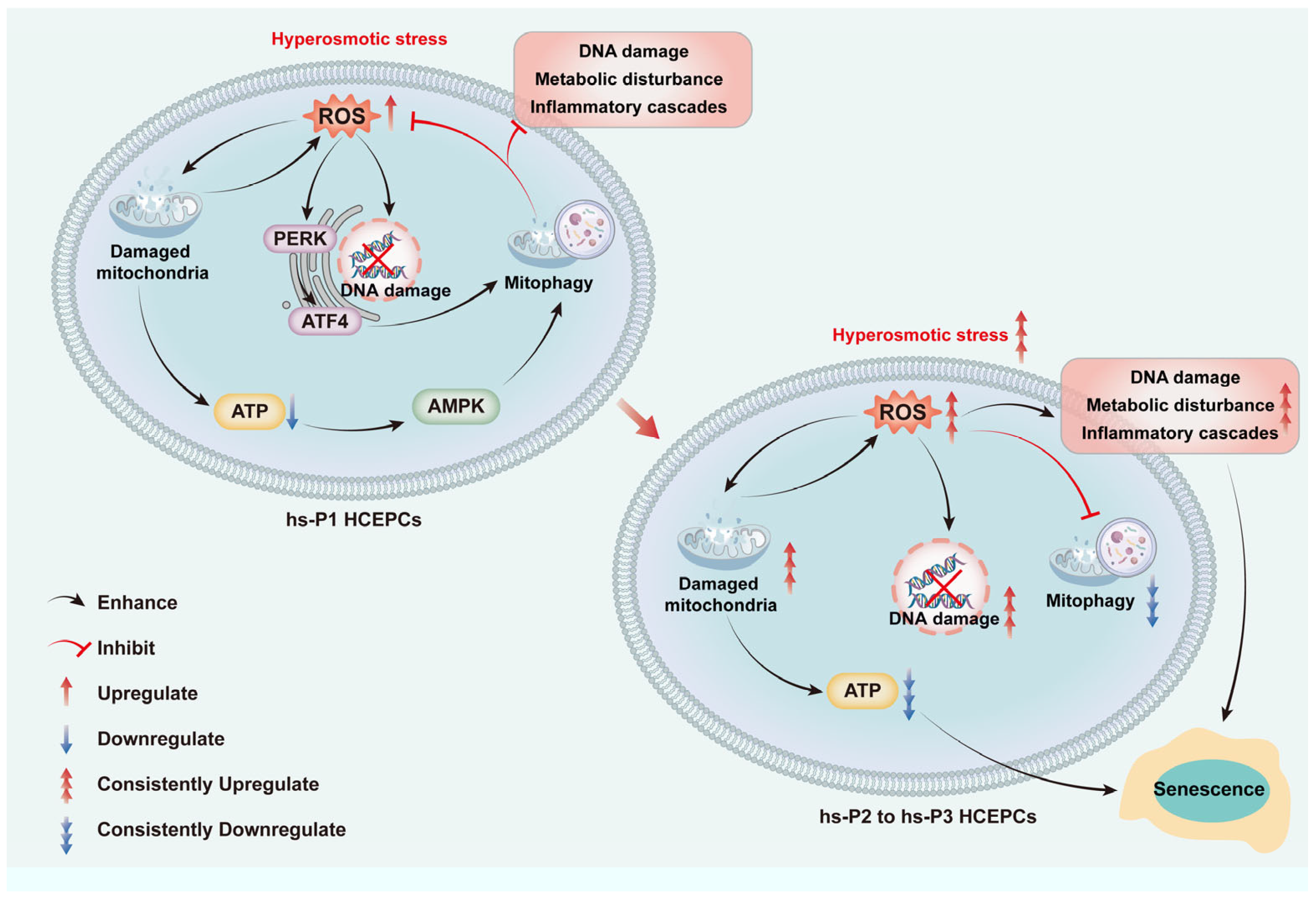 Zhang Y, Fan T. Hyperosmolarity-Induced Oxidative Stress Leads to Senescence in Human Corneal Epithelial Cells (HCEPC) via DNA Damage, Metabolic Disturbance and Mitophagy Decline. Antioxidants. 2025; 14(11):1381. https://doi.org/10.3390/antiox14111381