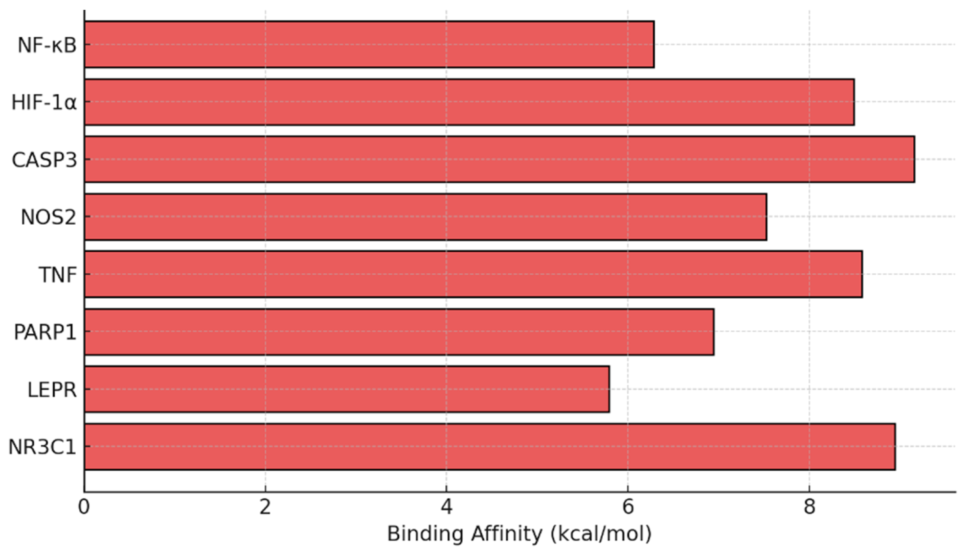 Molecular docking simulations were performed to predict the binding affinity of dexamethasone with key target proteins identified in the bioinformatic network (NF-κB, HIF-1α, CASP3, NOS2, TNF, PARP1, LEPR, and NR3C1). The docking results revealed strong interactions, particularly with NF-κB (≥−6 kcal/mol) and CASP3 (≥−6 kcal/mol), indicating the potential modulation of inflammatory and apoptotic signaling cascades by dexamethasone. These in silico findings complement the experimental data and provide molecular-level evidence supporting the observed neuroprotective outcomes (Figure 7).