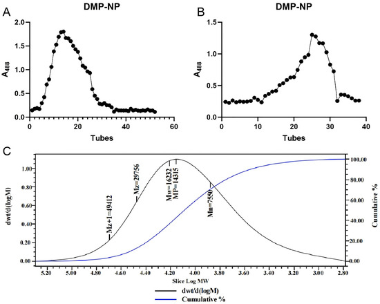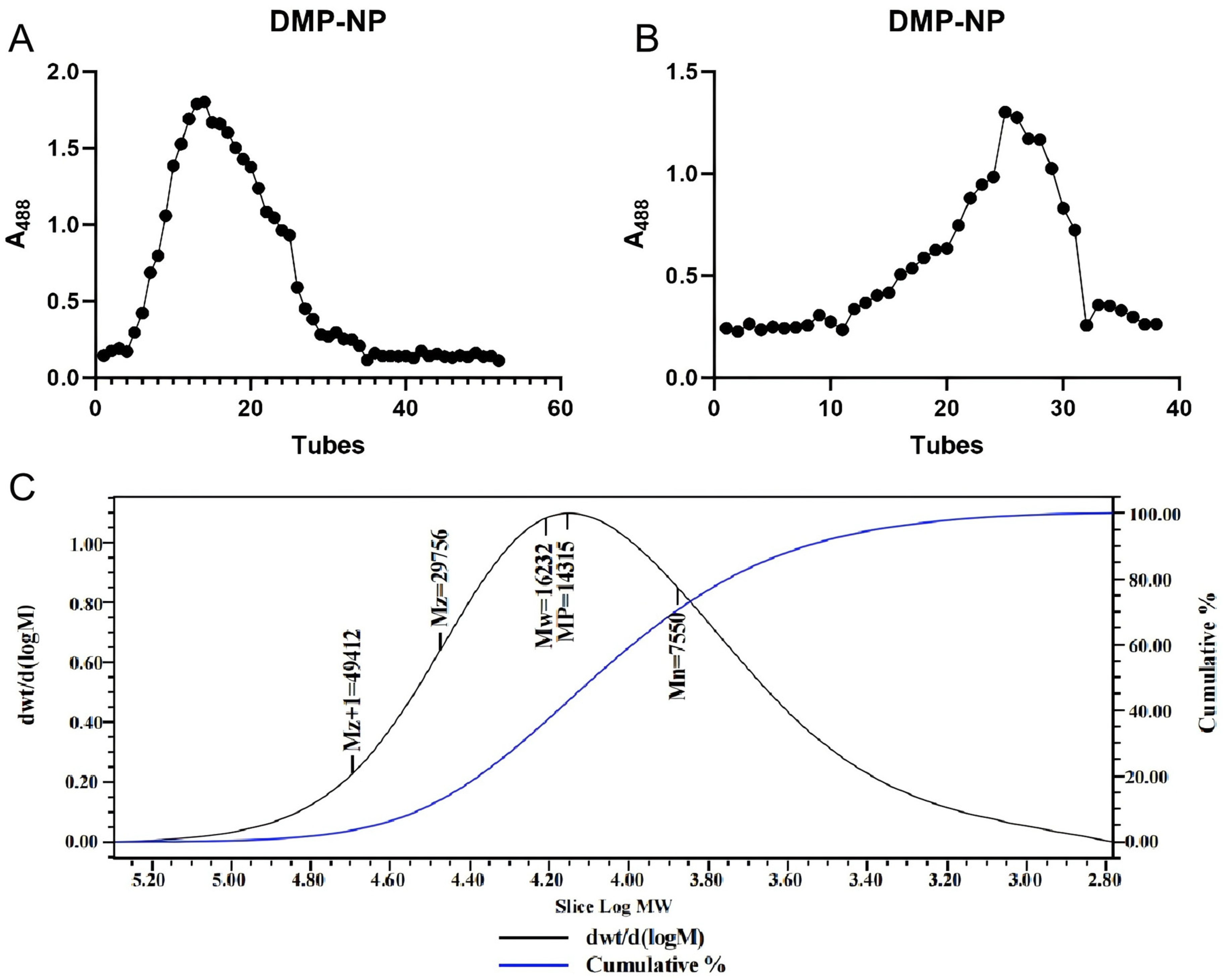 The weight-average molecular weight of DMP-NP1 was determined by gel permeation chromatography coupled with multi-angle light scattering (GPC-MALS). The system consisted of a Thermo U3000 HPLC system (Thermo Fisher Scientific, Walthan, MA, USA) and a Wyatt DAWN HELEOS II MALS detector (Wyatt Technology, Santa Barbara, CA, USA). Purified DMP-NP1 (5 mg) was dissolved in 1 mL of 0.1 M sodium nitrate to yield a 5 mg/mL stock solution. Polyethylene oxide (PEO) solution with a molecular weight of 18.67 kDa was used as the standard. Chromatographic separation was performed under the following conditions: 100 μL injection volume, 0.9% (w/v) NaCl mobile phase, 0.5 mL/min flow rate, and a column temperature maintained at 30 °C. The molecular weight of the sample was analyzed and determined using the GPC-MALS system by comparison with the standard.