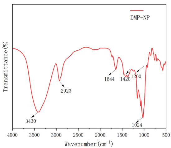 For FT-IR analysis, 1 mg of dried DMP-NP1 was thoroughly blended with potassium bromide, finely ground using an agate mortar, and compressed into transparent pellets. Spectra were acquired in the range of 4000–400 cm−1 on a Fourier transform infrared (FT-IR) spectrometer (Tensor 27, Bruker, Karlsruhe, Germany).