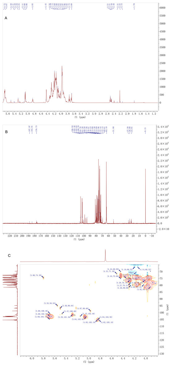 Structural characterization of D. moschatum polysaccharides (DMP-NP1): (A) 1H-NMR, (B) 13C-NMR and (C) HSQC spectra of DFM-NP1.