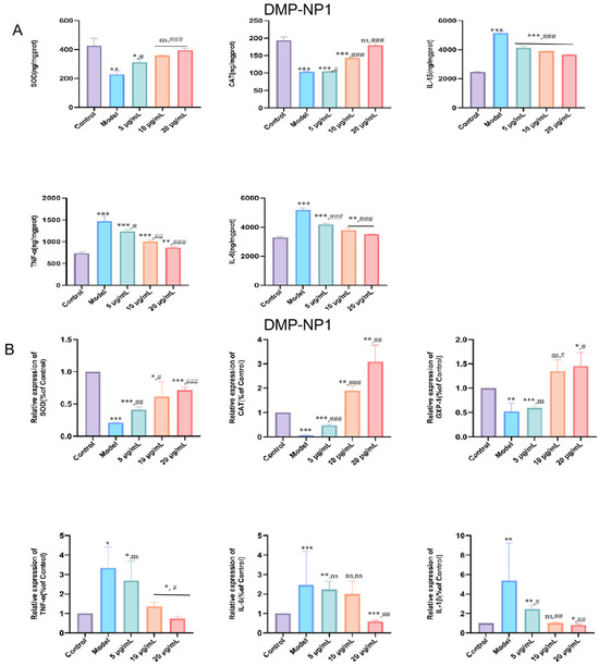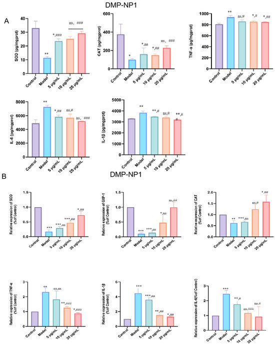 Effects of DMP-NP1 on the contents of CAT, SOD, TNF-α, IL-1β and IL-6 in IPEC-J2 cells (A); Effect of DMP-NP1 on the expression of CAT, SOD, GXP-1, TNF-α, IL-1β, IL-6 (B). (n = 5) (IPEC-J2 cells were pretreated with DMP-NP1 (5, 10, 20 μg/mL) for 24 h, followed by exposure to LPS (20 μg/mL) for 24 h, control cells received no treatment, and the model group was exposed to LPS alone.) (Compared with the control group, * p < 0.05, ** p < 0.01, *** p < 0.001, ns represents no significant difference; Compared with the model group, # p < 0.05, ## p < 0.01, ### p < 0.001, ns represents no significant difference).