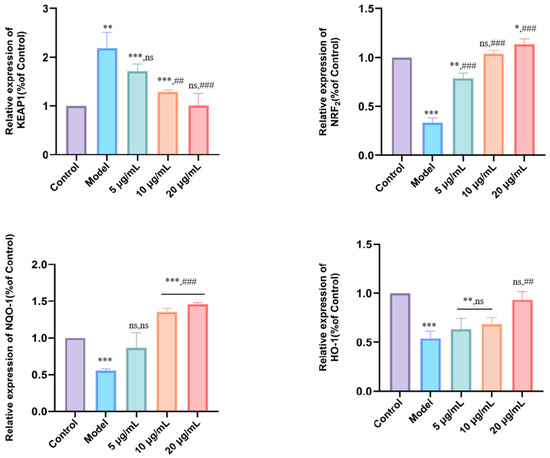 Effect of DMP-NP1 on genes related to oxidative stress pathway. (n = 5) (Compared with the control group, * p < 0.05, ** p < 0.01, *** p < 0.001, ns represents no significant difference; Compared with the model group, ## p < 0.01, ### p < 0.001, ns represents no significant difference).