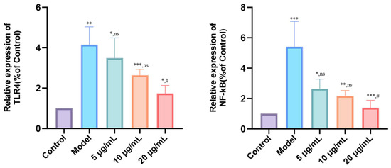 To elucidate the anti-inflammatory mechanism of DMP-NP1, we analyzed the expression of key genes in the TLR4/NF-κB signaling pathway and their subsequent impact on the pro-inflammatory cytokines TNF-α, IL-1β, and IL-6 in LPS-induced IPEC-J2 cells. The results showed that, compared with the control group, the model group exhibited a significant upregulation of TLR4 mRNA (p < 0.01) and a marked increase in NF-κB mRNA expression (p < 0.001) (Figure 8). Similarly, no significant differences in NF-κB expression were observed in the 5 μg/mL (0.31 μM) and 10 μg/mL (0.62 μM) groups, while treatment with 20 μg/mL (1.23 μM) DMP-NP1 significantly downregulated NF-κB mRNA expression (p < 0.05).