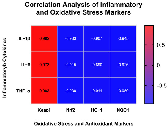 To investigate the relationship between inflammation and oxidative stress signaling, Pearson correlation analysis was performed between cytokine protein levels (IL-1β, IL-6, TNF-α) and the mRNA expression of antioxidant-related genes (Keap1, Nrf2, HO-1, NQO1). The Pearson correlation matrix between inflammatory cytokines and antioxidant-related gene expression is shown in Figure 9. We found IL-1β, IL-6, and TNF-α levels were strongly and positively correlated with Keap1 expression (r = 0.982–0.983, p < 0.01), whereas they were negatively correlated with Nrf2, HO-1, and NQO1 expression (r = −0.89 to −0.95, p < 0.05). These results suggest that DMP-NP1 may alleviate inflammation through the suppression of Keap1 and concomitant activation of the Nrf2/ARE pathway.