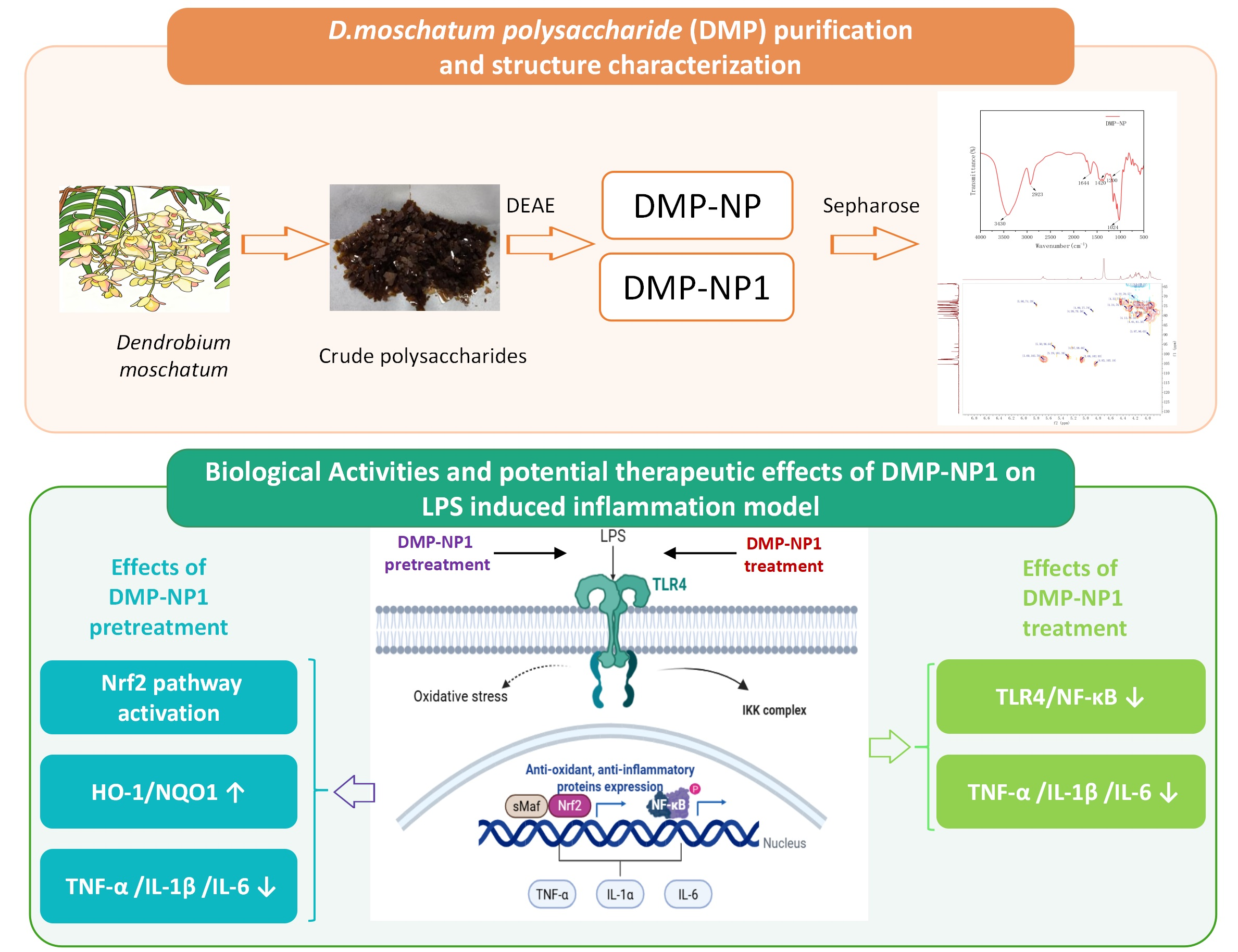 Inflammatory bowel disease (IBD), a chronic gastrointestinal disorder characterized by abdominal pain, diarrhea, and progressive intestinal damage, has emerged as a global health challenge with rising incidence and limited therapeutic options [1]. While current clinical treatments, including corticosteroids, immunosuppressants, and biologics, can alleviate symptoms, prolonged use frequently results in severe complications such as osteoporosis, metabolic disorders, and gastrointestinal dysfunction [2]. Consequently, the development of natural plant-based drugs with high efficacy and low toxicity is an urgent area of research. Among these, polysaccharides from Dendrobium species, a genus of medicinal orchids, have shown remarkable potential in mitigating inflammation-related pathologies.