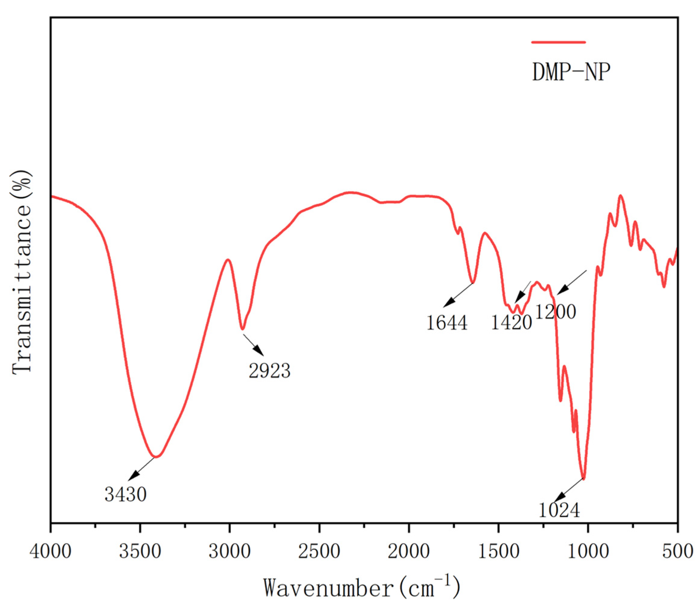 To further analyze the chemical structure and functional groups of Dendrobium polysaccharides, we conducted infrared spectroscopy. This technique provides information on the absorption characteristics of different functional groups in molecules, helping reveal the chemical composition and structural features of polysaccharides. The FT-IR spectrum of DMP-NP1 is shown in Figure 2. The FT-IR spectrum exhibited characteristic polysaccharide absorptions [17], including a broad band at 3430–3000 cm−1 (O–H/N–H stretching) and a distinct peak at 2923 cm−1 (C–H stretching) [17]. These collective features confirmed the polysaccharidic nature of the purified neutral fraction from Dendrobium. Additional key features included an absorption at 1644 cm−1, indicative of C=O stretching in N-acetyl groups, and bands in the 1420–1200 cm−1 region, assigned to C–H bending vibrations [18]. Furthermore, the prominent peak at 1024 cm−1 is characteristic of C–O–C stretching in pyranose rings [19].