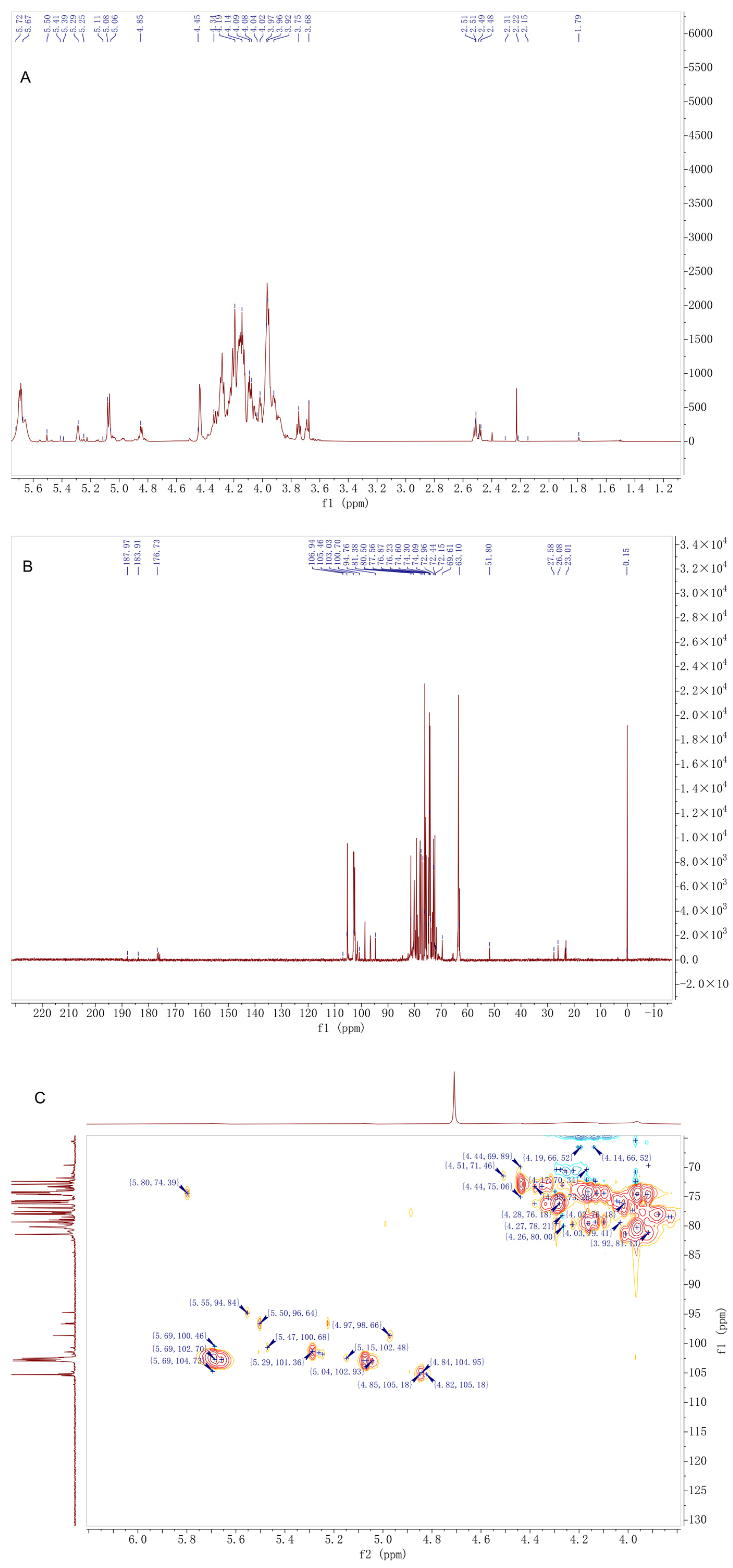 Figure 3. Structural characterization of D. moschatum polysaccharides (DMP-NP1): (A) 1H-NMR, (B) 13C-NMR and (C) HSQC spectra of DFM-NP1.