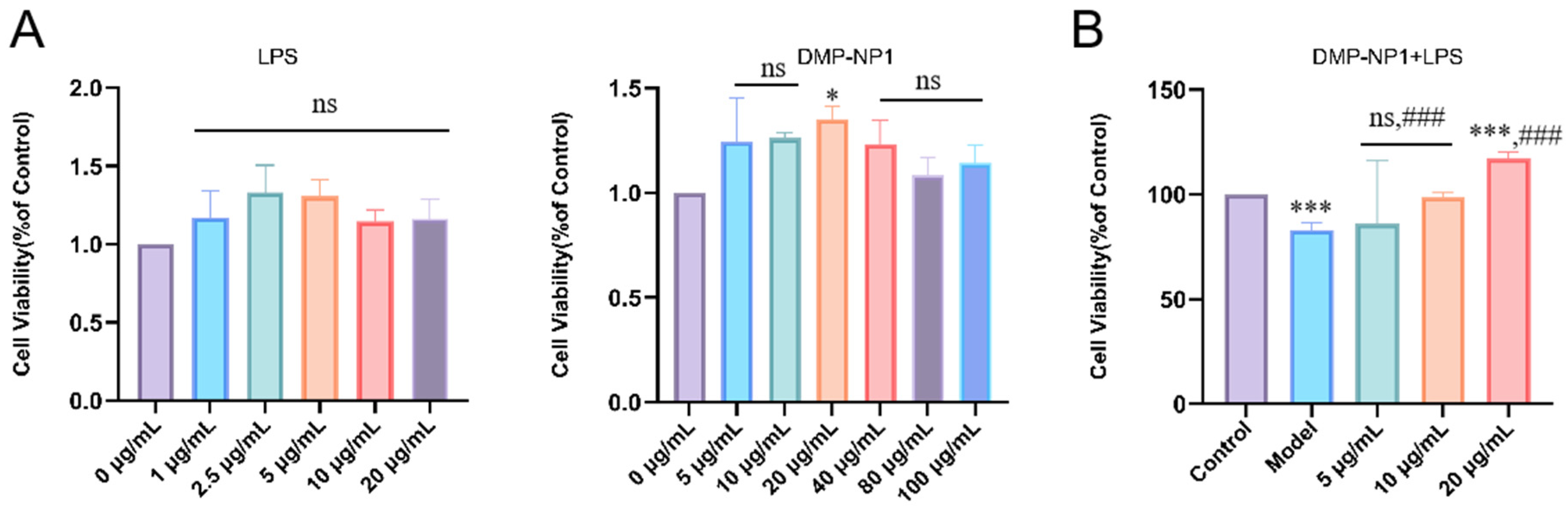 Figure 4. Cytotoxicity test. The effects of LPS and DMP-NP1 on cell viability (A); Effect of LPS on cell viability after treatment with different concentrations of DMP-NP1 (B). (n = 5) (Compared with the control group, * p < 0.05, *** p < 0.001, ns represents no significant difference; Compared with the model group, ### p < 0.001, ns represents no significant difference).