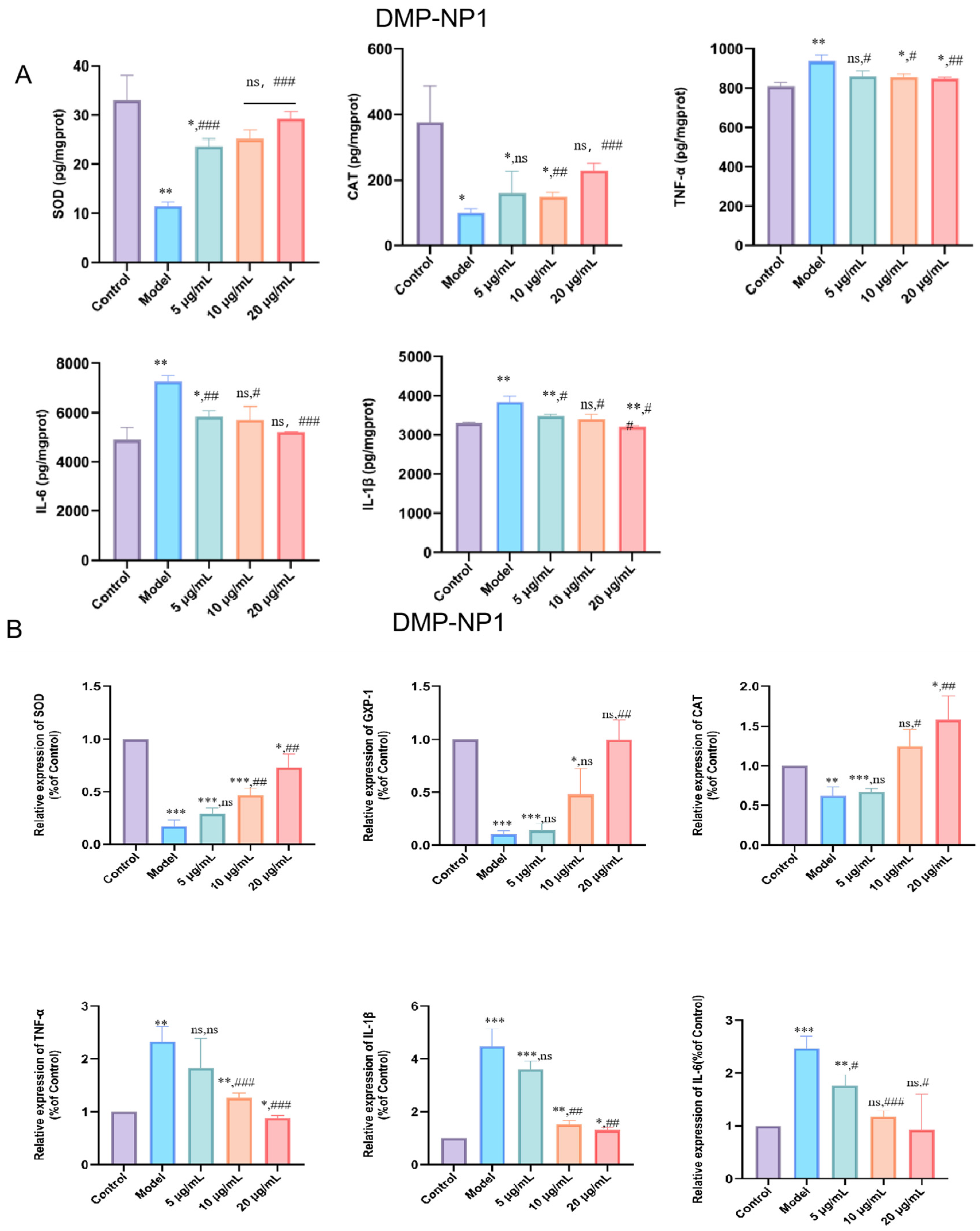 Figure 5. Effects of DMP-NP1 on the contents of CAT, SOD, TNF-α, IL-1β and IL-6 in IPEC-J2 cells (A); Effect of DMP-NP1 on the expression of CAT, SOD, GXP-1, TNF-α, IL-1β, IL-6 (B). (n = 5) (IPEC-J2 cells were pretreated with DMP-NP1 (5, 10, 20 μg/mL) for 24 h, followed by exposure to LPS (20 μg/mL) for 24 h, control cells received no treatment, and the model group was exposed to LPS alone.) (Compared with the control group, * p < 0.05, ** p < 0.01, *** p < 0.001, ns represents no significant difference; Compared with the model group, # p < 0.05, ## p < 0.01, ### p < 0.001, ns represents no significant difference).