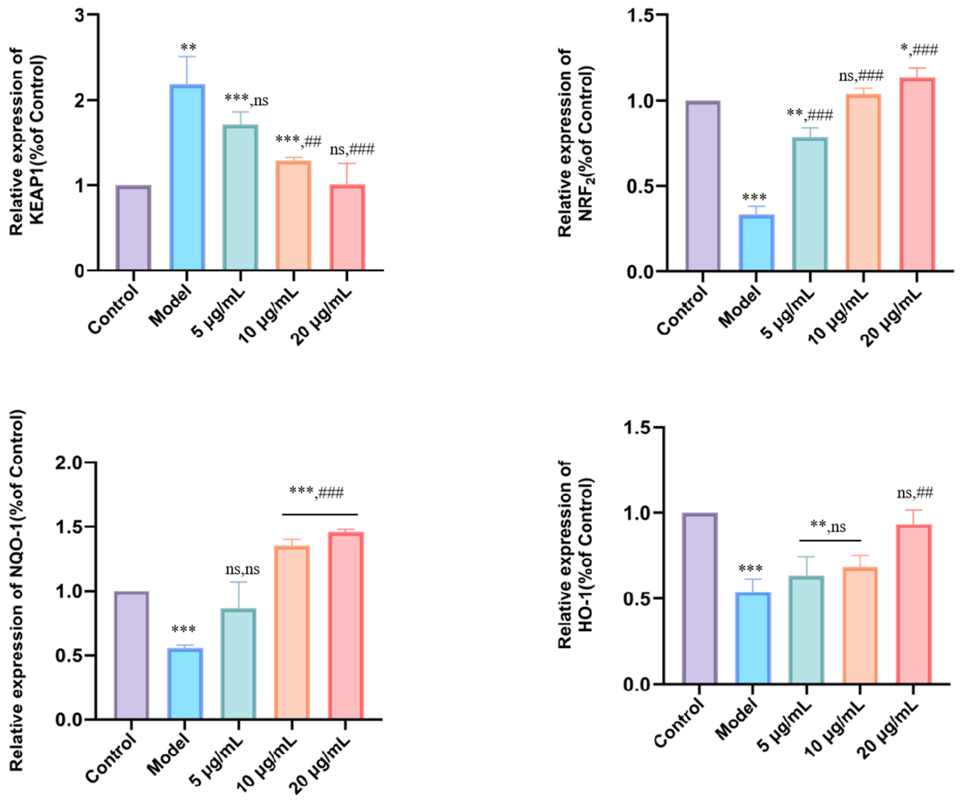 Figure 7. Effect of DMP-NP1 on genes related to oxidative stress pathway. (n = 5) (Compared with the control group, * p < 0.05, ** p < 0.01, *** p < 0.001, ns represents no significant difference; Compared with the model group, ## p < 0.01, ### p < 0.001, ns represents no significant difference).