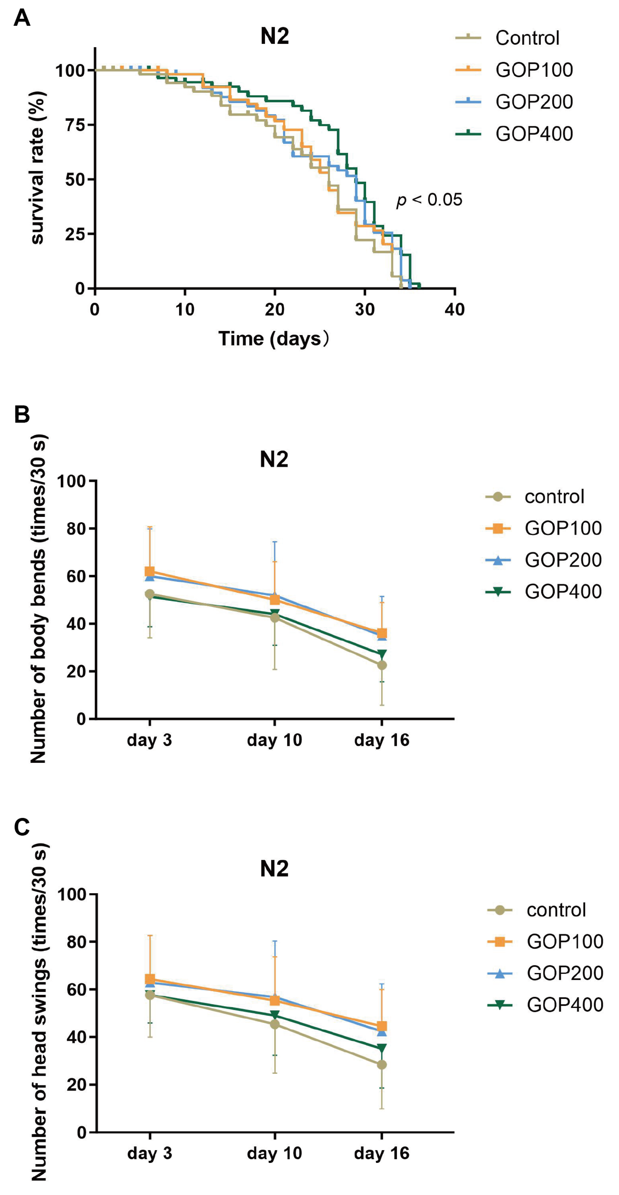3.1. GOP Extends Lifespan and Attenuates Age-Associated Decline in Locomotion of C. elegans