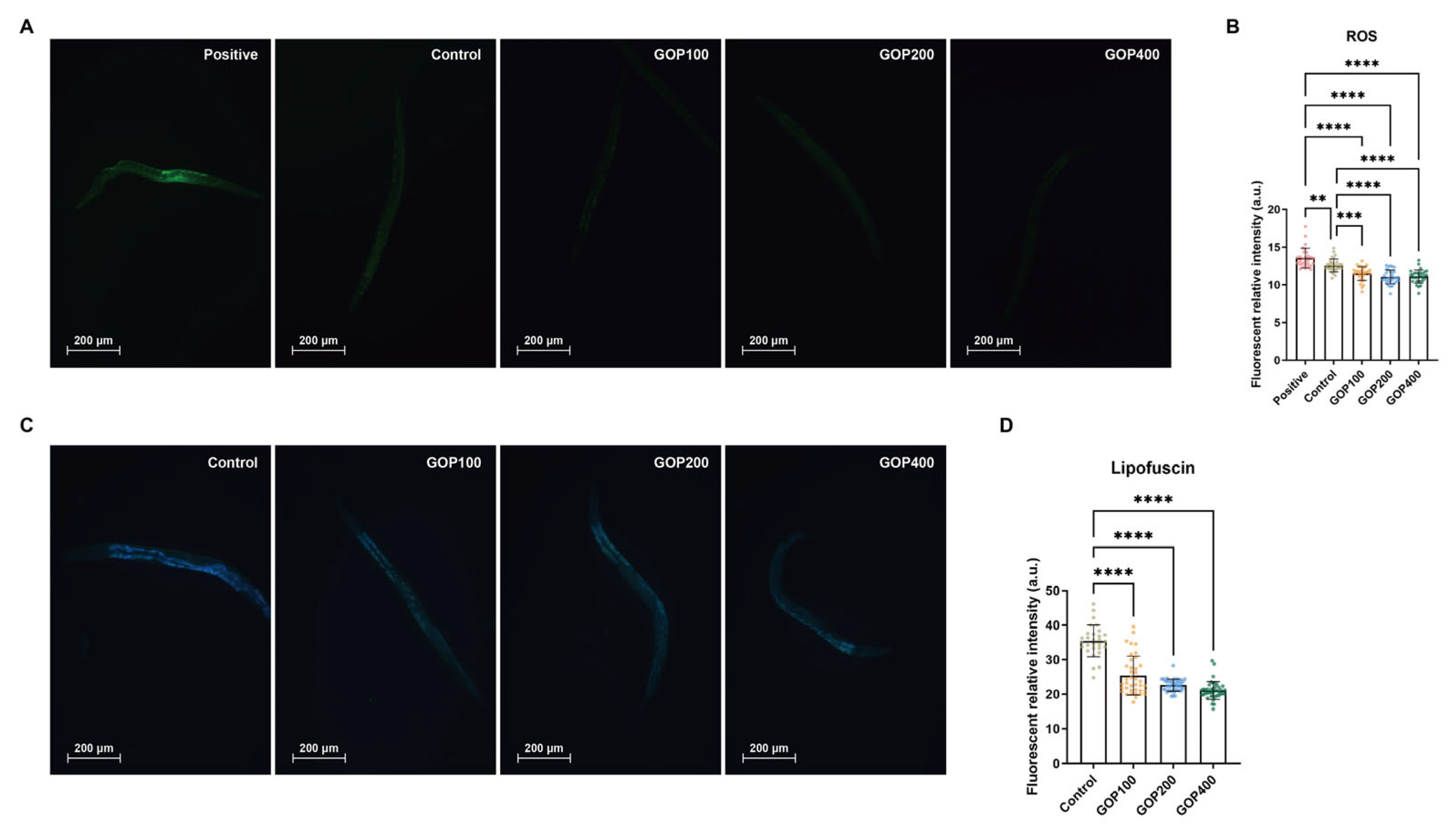 3.4. GOP Reduces Intracellular ROS Levels and Lipofuscin Accumulation in C. elegans