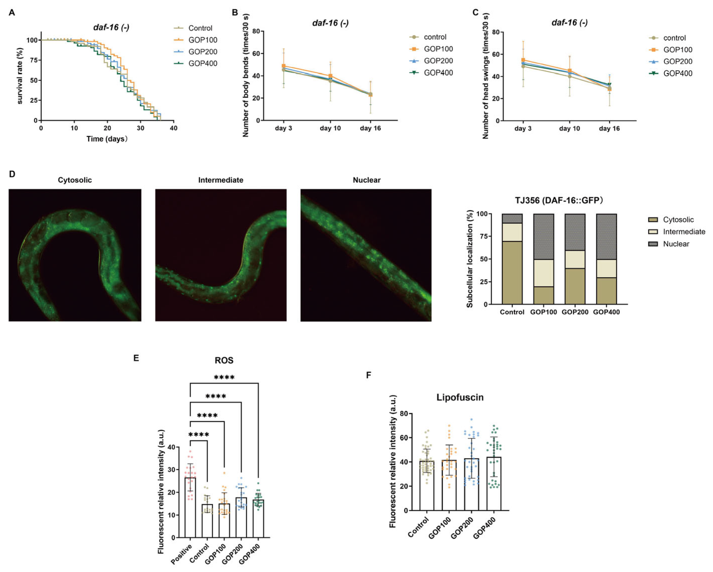 3.5. The Anti-Aging Effects of GOP Depend on the DAF-16/FOXO Pathway