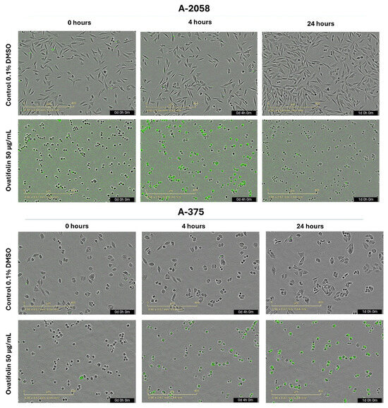 Microscopy by IncuCyte® live-cell analysis system used to study images of Sytox Green-stained A2058 and A375 cells treated with ovatifolin 50 μg/mL (163.4 µM); observations at 0, 4 h and 24 h after the end of treatment.