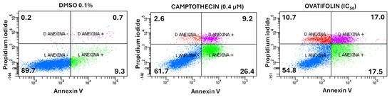 Flow cytometry analysis of cell death induction by ovatifolin at 18.4 μg/mL (60.1 µM) in A375 melanoma cancer cells. Annexin V and propidium iodide (PI) were used to distinguish between viable cells (Annexin V−/PI−), early apoptotic cells (Annexin V+/PI−), late apoptotic or secondary necrotic cells (Annexin V+/PI+), and primary necrotic cells (Annexin V−/PI+). Camptothecin (0.4 μM) was used as a positive control, while 0.1% DMSO served as a negative control. Treatment with ovatifolin reduced the viability of A375 cells and increased apoptosis levels. The percentage of cells in each state is shown in the respective quadrants.