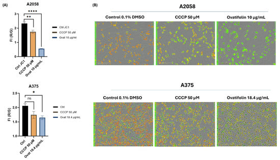 Effects of ovatifolin on the mitochondrial membrane potential of A2058 and A375 melanoma cells. (A) Quantification of reduction in ΔΨ m following treatment at 2 h with ovatifolin 27.6 and 18.4 μg/mL (90.2 and 60.1 µM) for A2058 and A375 cell lines, respectively, measured by loss in red/green fluorescence compared to the control (* p < 0.05, ** p < 0.01, **** p < 0.001); “ns”: no significant differences. Data are presented as the means of three replicates. (B) Microscopy images of fluorescence with JC-1 under different conditions at time 2 h of the experiment (6 h).