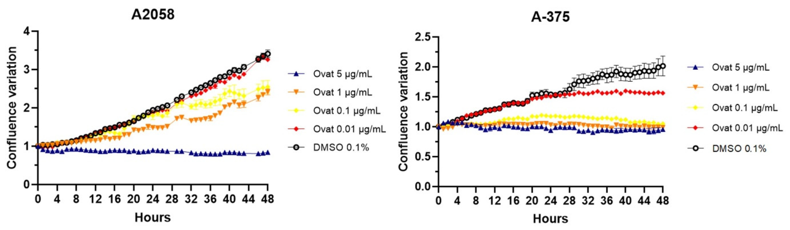 3.3. Ovatifolin Reduces the Proliferative Activity of A2058 and A375 Cells