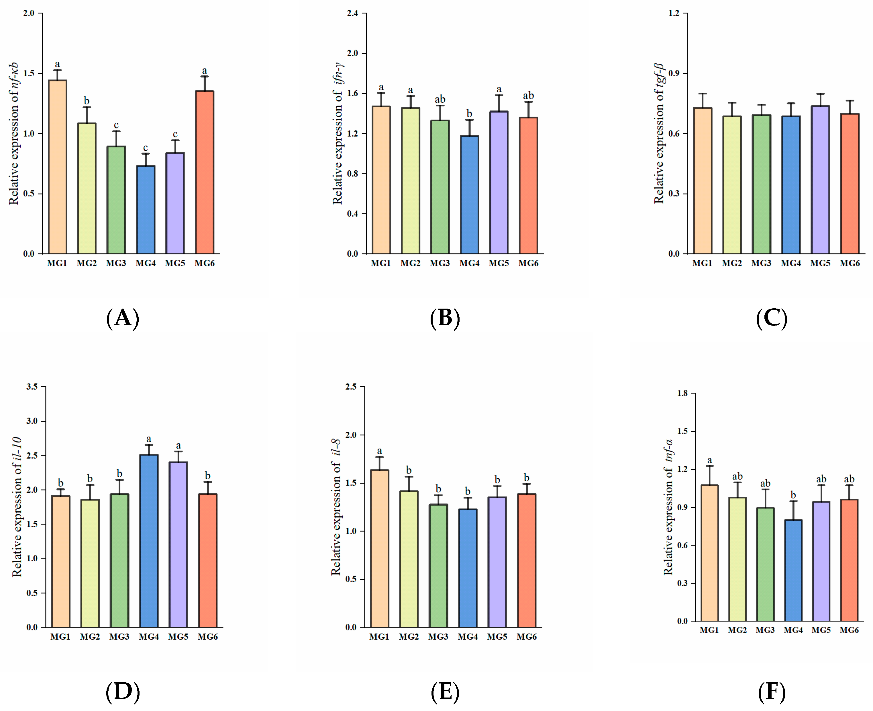 The expressions of nf-κb, il-8, and tnf-α showed a decreasing and then increasing trend, reaching the minimum in the MG4 group (p < 0.05, Figure 6A,E,F). The expression of ifn-γ in the MG4 group was significantly downregulated compared to the MG1, MG2, and MG5 groups (p < 0.05, Figure 6B). The expressions of il-10 in the MG4 and MG5 groups showed marked elevation relative to other groups (p < 0.05, Figure 6D). No significant difference observed in tgf-β expression (p > 0.05, Figure 6C).