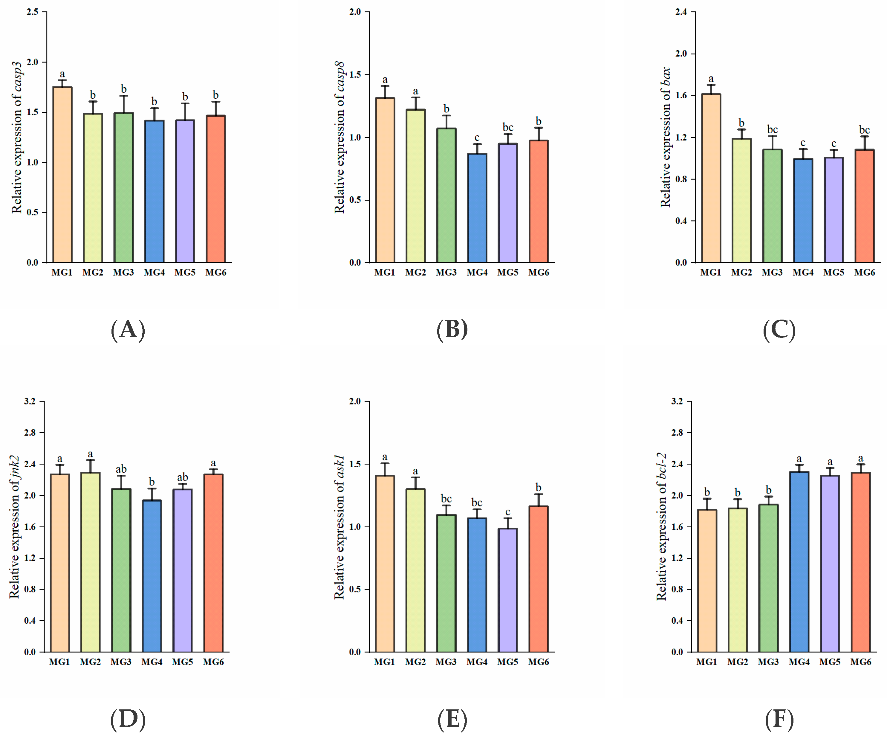 The expressions of casp3 and bax exhibited significant downregulation in the MG2–MG6 groups, reaching minimal levels in the MG4 group (p < 0.05, Figure 7A,C). The MG4 group demonstrated the lowest casp8 and jnk2 expressions, with the MG5 group showing the lowest ask1 expression (p < 0.05, Figure 7B,D,E). In contrast, bcl-2 expression displayed marked upregulation in the MG4-MG6 groups relative to the MG1–MG3 groups (p < 0.05, Figure 7F).
