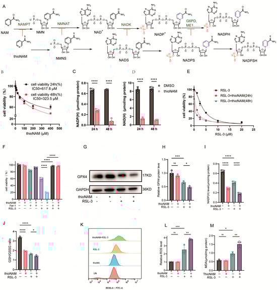 ThioNAM Depletes NADP(H) and Sensitizes Cells to Ferroptosis (A) Schematic diagram of thioNAM and its metabolites inhibiting enzymes involved in NADPH generation. (B) Cell viability assessment via CCK-8 assay following 24 h or 48 h treatment with varying thioNAM concentrations. (C,D) Quantification of (C) NADP(H) and (D) NAD(H) levels in cells treated with 50 μM thioNAM for 24 h or 48 h. (E) Cell viability assessment via CCK-8 assay in cells pretreated with 50 μM thioNAM for 24 h or 48 h, followed by 24 h exposure to gradient RSL-3 concentrations. (F) Cell viability analysis employing CCK-8 assay in cells preincubated with or without 50 μM thioNAM for 24 h, subsequently treated with 2.5 μM RSL-3 and 10 μM Fer-1 for an additional 24 h. (G–M) Cells were pretreated with 50 μM thioNAM for 24 h, then co-treated with 2.5 μM RSL-3 for an additional 24 h, (G) GPX4 protein expression was analyzed by Western blot. (H) Densitometric quantification of GPX4 protein expression. (I) NADP(H) levels. (J) GSH/GSSG ratio. (K) ROS levels measured by flow cytometry. (L) Quantification of ROS. (M) Malondialdehyde (MDA) content determination. All data are presented as mean ± SD from three independent experiments. Statistical significance was determined by one-way ANOVA; ns: not significant, * p < 0.05, ** p < 0.01, *** p < 0.001, **** p < 0.0001.