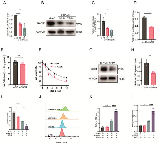 Knockdown of NADK downregulated GPX4 protein expression (Figure 2G,H), further reduced NADP(H) levels in RSL-3-treated cells (Figure 2I), and decreased the GSH/GSSG ratio (Figure 2J). Although knockdown of NADK alone did not increase intracellular ROS or MDA levels, it significantly enhanced RSL-3-induced ROS and MDA production (Figure 2K–L).
