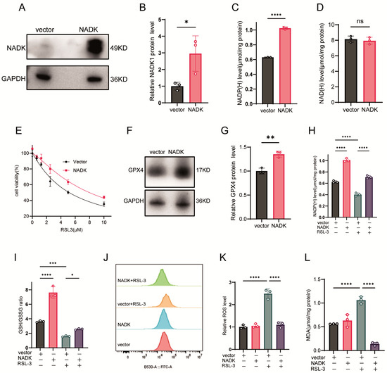 We further investigated the effect of NADK overexpression on NADP(H) levels and ferroptosis sensitivity. The expression of NADK protein was confirmed by western-blot assay (Figure 3A,B). NADK increased intracellular NADP(H) levels (Figure 3C) but NAD(H) levels were not affected (Figure 3D). It also attenuated RSL-3 induced ferroptosis (Figure 3E). Additionally, NADK upregulated GPX4 protein expression (Figure 3F,G), restored NADP(H) levels in RSL-3-treated cells (Figure 3H), and elevated the GSH/GSSG ratio (Figure 3I). While NADK overexpression alone did not affect basal ROS or MDA levels, it significantly reduced ROS and MDA levels in cells treated with RSL-3 (Figure 3J–L).