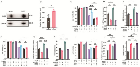 HT1080 cells were transfected with a G6PD plasmid and the expression of the corresponding protein was confirmed by western-blot assay (Figure 4A,B). Overexpression of G6PD enhanced cellular resistance to ferroptosis; however, this effect was abolished upon concurrent treatment with thioNAM (Figure 4C). G6PD overexpression elevated intracellular NADP(H) levels, an effect that was also abolished by thioNAM (Figure 4D). Furthermore, G6PD elevated cellular GSH content and the GSH/GSSG ratio (Figure 4E), and this function was impaired by thioNAM. Similarly, knockdown of NADK abrogated the protective effect of G6PD against ferroptosis (Figure 4F), attenuated the G6PD-mediated increase in NADP(H) (Figure 4G), and reduced its ability to regulate the GSH/GSSG ratio (Figure 4H).