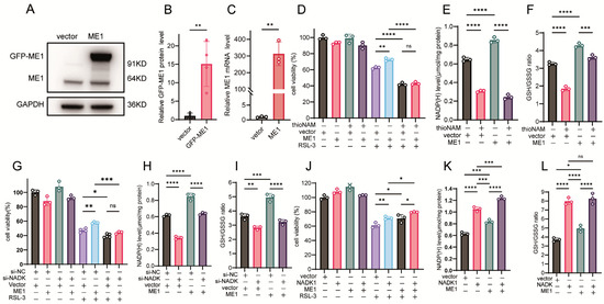 ME1 catalyzes the malate dehydrogenation and decarboxylation reaction coupled with NADPH generation, serving as another key pathway for maintaining intracellular NADPH homeostasis. Recent studies have further confirmed its role in countering ferroptosis [9]. We next examined whether NADK is involved in regulating ME1-mediated effects on ferroptosis. Transfection with a GFP-ME1 expression vector resulted in increased GFP-ME1 protein and ME1 mRNA levels (Figure 5A–C). Overexpression of ME1 conferred resistance to ferroptosis and elevated NADPH levels; however, these effects were abolished by thioNAM treatment (Figure 5D,E). ThioNA also attenuated the ability of ME1 to increase the GSH/GSSG ratio (Figure 5F). Knockdown of NADK eliminated the protective effect of ME1 against ferroptosis and impaired its capacity to enhance NADPH levels and the GSH/GSSG ratio (Figure 5G–I). Cells co-transfected with NADK and ME1 exhibited stronger resistance to ferroptosis than those expressing ME1 alone (Figure 5J). Furthermore, NADK overexpression demonstrated a more pronounced effect than ME1 in elevating intracellular NADPH levels and the GSH/GSSG ratio (Figure 5K,L).
