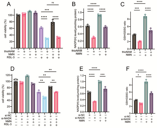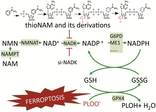 Ferroptosis was induced using the specific ferroptosis inducers RSL-3 (Cat# GC12431), iFSP1(Cat# GC45928) or BQR (Brequinar; Cat# GC19082) (GlpBio, Montclair, CA, USA). The following compounds were utilized: nicotinamide mononucleotide (NMN, GlpBio; Cat# GC16971), thionicotinamide (thioNAM, GlpBio Cat# GD22321), and Ferrostatin-1 (TargetMol, Shanghai, China; Cat# 347174-05-4).