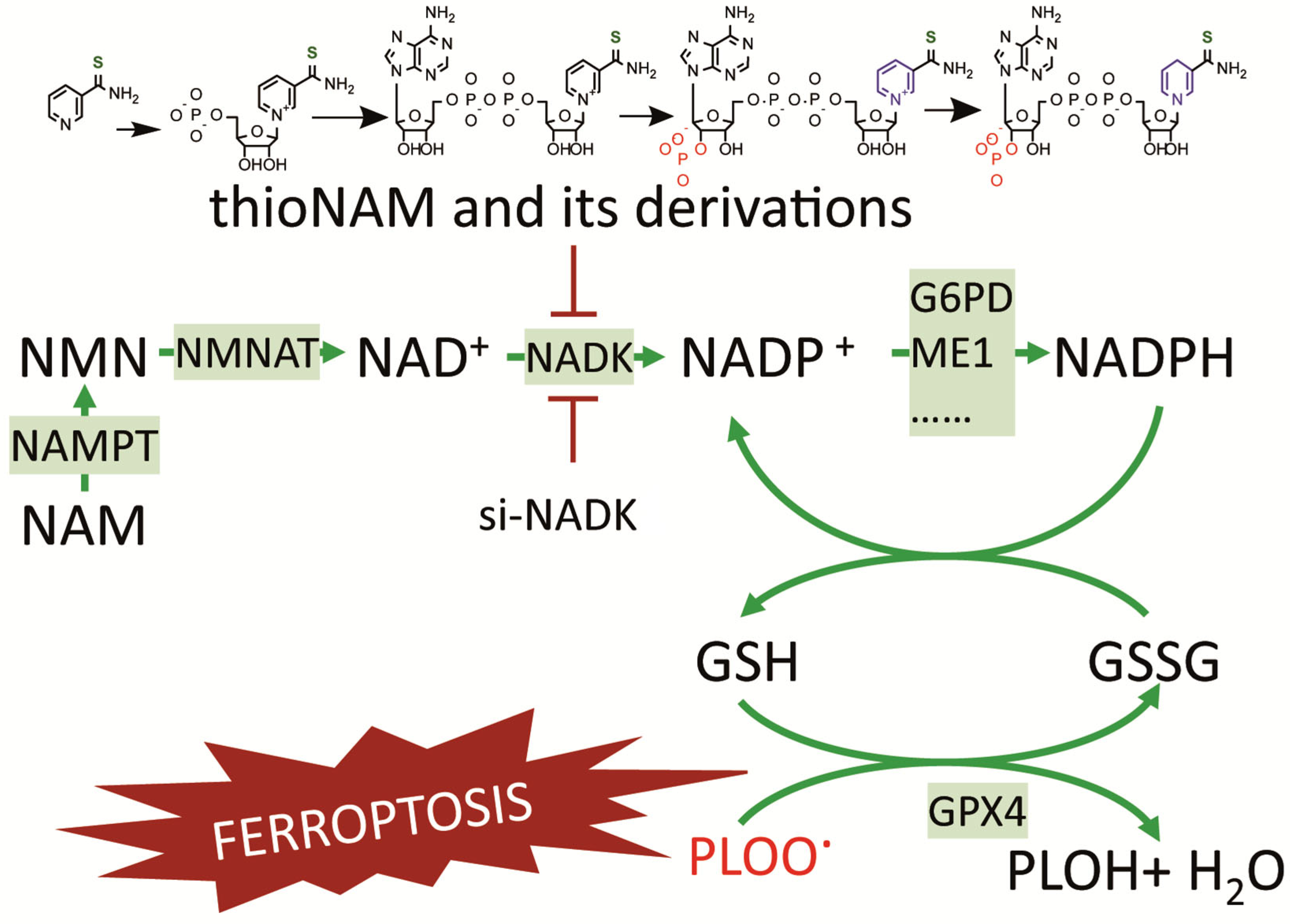 - Meng, X.; Peng, F.; Yu, S.; Chi, X.; Wang, W.; Shao, S. Knockdown of NADK promotes LUAD ferroptosis via NADPH/FSP1 axis. J. Cancer Res. Clin. Oncol. 2024, 150, 228. [Google Scholar] [CrossRef]
