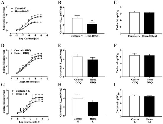 Concentration–response curves to carbachol in mouse detrusor smooth muscle: (A) Curves obtained in tissues pre-incubated with vehicle (Control–v) or heme (100 µM). (D) Curves obtained in the presence of the sGC inhibitor ODQ (10 µM) with or without heme (100 µM). (G) Curves obtained in the presence of the HO inhibitor 1J (100 µM) with or without heme (100 µM). (B,E,H) Maximal contractile responses (Eₘₐₓ, expressed as mN/mg of tissue) derived from the concentration–response curves shown in (A), (D), and (G), respectively. (C,F,I) Potency values (pEC50), calculated as the negative logarithm of the molar concentration of carbachol that produces 50% of the maximal contraction, indicating tissue sensitivity to the agonist. Contractile responses of smooth muscle are expressed as mN/mg of tissue. Data are shown as the mean ± SEM from nine independent experiments. Statistical analyses were performed using unpaired Student’s t-tests. * p < 0.05 vs. respective control group. V, vehicle.