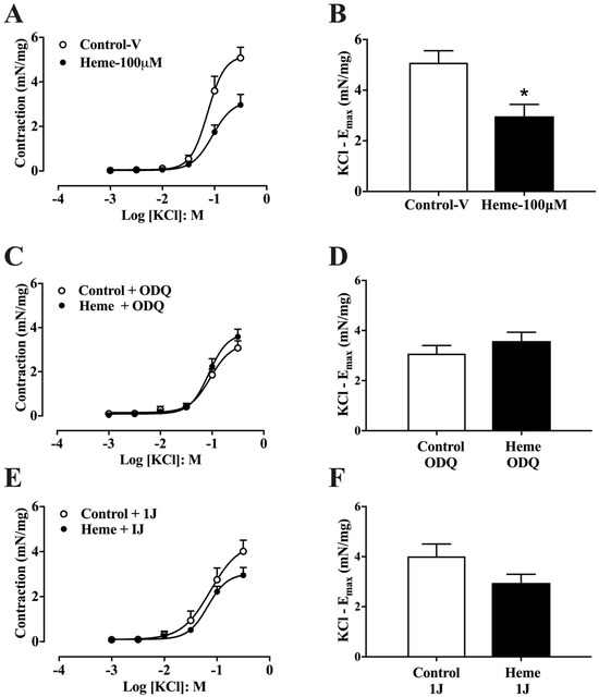 Concentration–response curves to KCl in mouse detrusor smooth muscle: (A) Curves obtained in tissues pre-incubated with vehicle (Control–v) or heme (100 µM). (C) Curves obtained in the presence of the sGC inhibitor ODQ (10 µM) with or without heme (100 µM). (E) Curves obtained in the presence of the HO inhibitor 1J (100 µM) with or without heme (100 µM). (B,D,F) Maximal contractile responses (Emax). Contractile responses of smooth muscle are expressed as mN/mg of tissue. Data are shown as the mean ± SEM from nine independent experiments. Statistical analyses were performed using unpaired Student’s t-tests. * p < 0.05 vs. respective control group. V, vehicle.
