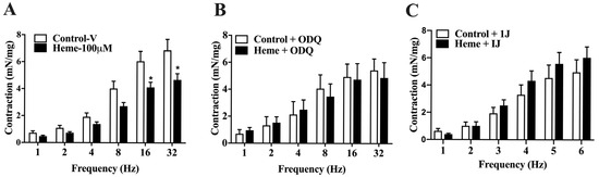 Frequency-dependent contractions of mouse detrusor smooth muscle induced by EFS: (A) Contraction responses in tissues pre-incubated with vehicle (Control–v) or heme (100 µM). (B) Responses obtained in the presence of the sGC inhibitor ODQ (10 µM) with or without heme (100 µM). (C) Responses obtained in the presence of the HO inhibitor 1J (100 µM) with or without heme (100 µM). Contractile responses of smooth muscle are expressed as mN/mg of tissue. Statistical analyses were performed using unpaired Student’s t-tests. Data are shown as the mean ± SEM from eight independent experiments. * p < 0.05 vs. respective control group. V, vehicle.