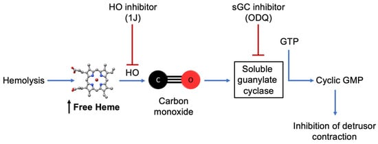 Proposed mechanism of heme-induced detrusor relaxation. Excess free heme, such as that released during intravascular hemolysis, can be metabolized by HO to generate CO. CO activates sGC, increasing cGMP levels and leading to inhibition of detrusor smooth muscle contraction. In this study, ex vivo exposure to heme reproduced this pathway, while pharmacological inhibition of HO (1J) or sGC (ODQ) abolished the effect, confirming the involvement of the HO–CO–sGC–cGMP signaling cascade in bladder relaxation.