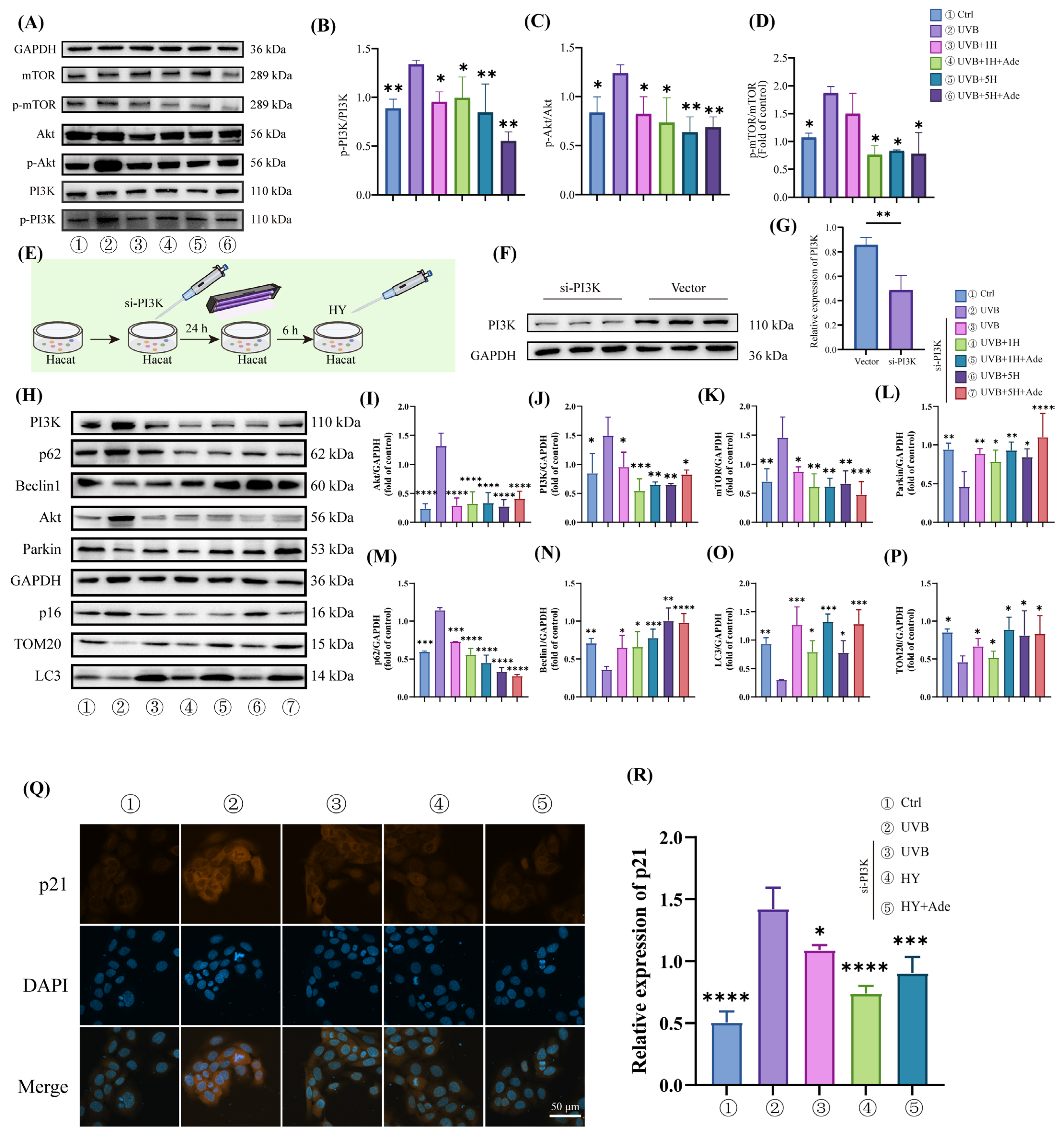 - Chen, Q.; Zhang, H.; Yang, Y.; Zhang, S.; Wang, J.; Zhang, D.; Yu, H. Metformin Attenuates UVA-Induced Skin Photoaging by Suppressing Mitophagy and the PI3K/AKT/mTOR Pathway. Int. J. Mol. Sci. 2022, 23, 6960. [Google Scholar] [CrossRef] [PubMed]