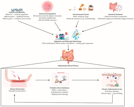 The gut microbiota serves as both trigger and amplifier of disease activity []. Microbial antigens and metabolites influence the host immune system by engaging pattern recognition receptors and metabolic checkpoints []. At the same time, environmental factors such as diet, smoking, medications, and early-life exposures like breastfeeding alter the composition and activity of the gut microbiota [,]. These influences can modify gene expression via epigenetic mechanisms (DNA methylation, histone marks, and microRNAs), linking external cues to persistent changes in epithelial and immune cell behavior [,]. The result is a self-reinforcing loop in which barrier defects permit microbial translocation, innate and adaptive responses escalate, and redox imbalance (excess reactive oxygen species with inadequate antioxidant compensation) sustains tissue damage [,].