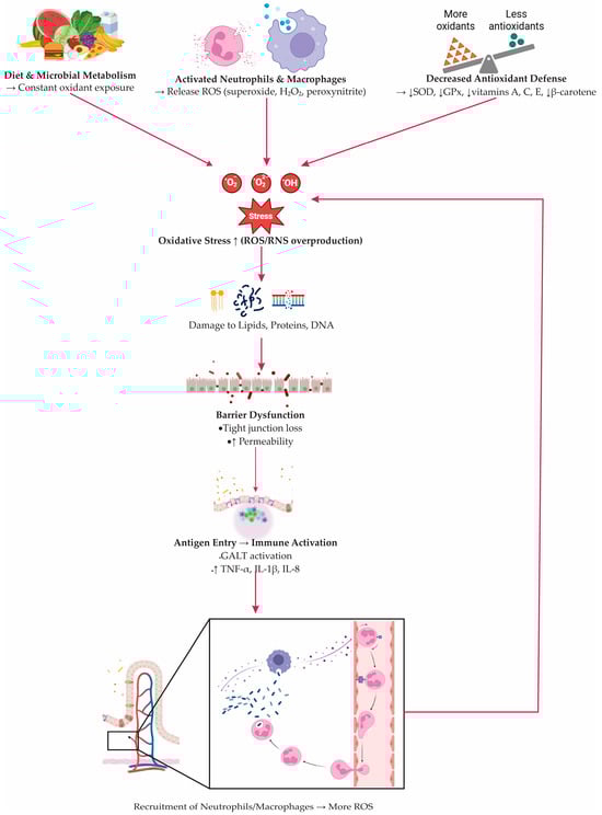 A disrupted redox balance undermines the structural and immunological integrity of the intestinal barrier. Excess ROS not only damage lipids, proteins, and DNA but also reshape epithelial signaling programs []. Lipid peroxidation products such as malondialdehyde and 4-hydroxynonenal disturb tight junction organization, increase mucosal permeability, and facilitate bacterial translocation [,]. As epithelial defenses weaken, luminal antigens gain access to immune compartments, amplifying Toll-like receptor signaling and promoting sustained recruitment of neutrophils and monocytes []. This establishes a self-reinforcing inflammatory loop: barrier leakage increases antigen load, immune activation escalates, and ROS generation rises even further.