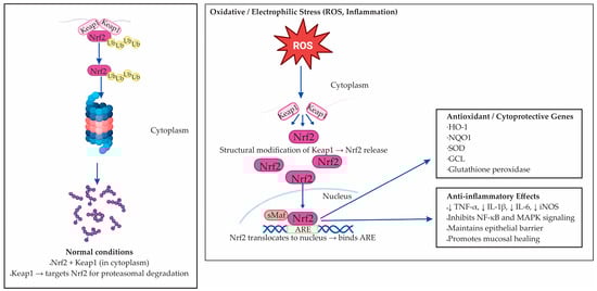 The Nrf2–Keap1 signaling pathway in oxidative and electrophilic stress. Under normal conditions, nuclear factor erythroid 2–related factor 2 (Nrf2) remains bound to Kelch-like ECH-associated protein 1 (Keap1) in the cytoplasm, where Keap1 targets Nrf2 for ubiquitination and proteasomal degradation. Upon exposure to oxidative or electrophilic stress, structural modification of Keap1 cysteine residues causes Nrf2 release and nuclear translocation. In the nucleus, Nrf2 forms heterodimers with small Maf proteins and binds to antioxidant response elements (AREs), initiating transcription of cytoprotective and antioxidant genes, including heme oxygenase-1 (HO-1), NAD(P)H:quinone oxidoreductase 1 (NQO1), superoxide dismutase (SOD), glutamate–cysteine ligase (GCL), and glutathione peroxidase. Activation of Nrf2 also suppresses pro-inflammatory mediators (TNF-α, IL-1β, IL-6, iNOS), inhibits NF-κB and MAPK signaling, preserves epithelial barrier integrity, and promotes mucosal healing.