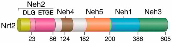Nuclear factor erythroid 2–related factor 2, encoded by the NFE2L2 gene, is a central transcriptional regulator of antioxidant defense and redox balance []. Originally cloned from the human leukemia K562 cell line, Nrf2 belongs to the Cap’n’Collar (CNC) subfamily of basic leucine zipper (bZIP) transcription factors, which also includes Nrf1, Nrf3, and the NF-E2 p45 subunit [,,]. The human Nrf2 protein consists of 605 amino acids and contains seven highly conserved functional domains, known as Nrf2 –ECH homology (Neh1–Neh7), each of which plays a specific role in regulating the stability, localization, and transcriptional activity of the protein [,]. The modular organization of Nrf2 and its conserved Neh domains, which mediate DNA binding, protein stability, and transcriptional activation, is illustrated in Figure 4.