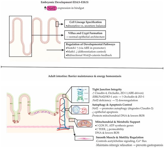 Moreover, recent findings implicate Nrf2 in the regulation of energy metabolism within the gastrointestinal epithelium []. In mice lacking Nrf2, the expression of mitochondrial proteins such as cytochrome c oxidase subunit IV (COX IV) and genes responsible for adenosine triphosphate (ATP) production is reduced, impairing the energy-dependent maintenance of tight junctions []. This is accompanied by increased DNA oxidative damage, reduced transepithelial electrical resistance (TEER), and enhanced permeability in models of gastroesophageal reflux disease (GERD) []. ChIP assays confirmed direct binding of Nrf2 to the Claudin-4 promoter, linking redox control to epithelial bioenergetics and structural integrity []. The developmental and physiological roles of Nrf2 in intestinal morphogenesis, barrier maintenance, and metabolic regulation are summarized in Figure 5.