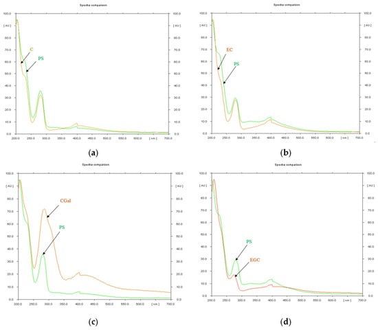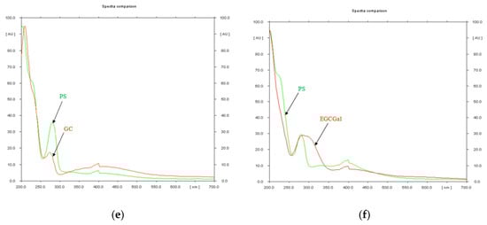 Spectral comparison of the condensed tannins references assigned in P. spinosa crude extract (PS)—(a) Catechin (C) and PS (b) Epicatechin (EC) and PS (c) Catechin gallate (CGal)and PS (d) Epigallocatechin (EGC) and PS (e) Gallocatechin (GC) and PS (f) Epigallocatechin gallate (EGCGal) and PS—Screening at 254 nm.