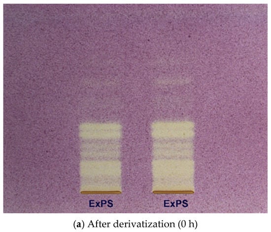 HPTLC plates derivatized with DPPH reagent for P. spinosa extract (ExPS) as visualized under visible light after derivatization (0 h)—(a) and after 24 h post-derivatization—(b).