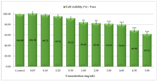 For normal Vero cells, low doses (0.05–0.5 mg/mL) of PS slightly interfered with cell development, so the cell viability did not change compared to the control, the percentage of live cells being 92.23% (0.5 mg/mL), respectively, 95.76% (0.2 mg/mL). A decrease in cell viability was reported between 1 and 4 mg/mL of PS and ranged from 84.48% (1 mg/mL) to 79.83% (4 mg/mL), while a second significant reduction in Vero cells proliferation was highlighted using high doses of PS (4.5 and 5 mg/mL), when cells viability was 68.90% and 62.11%, respectively (Figure 3). The results obtained are consistent with those in the literature, which mentioned that catechin structures, in addition to antioxidant action, also exert cytotoxic effects [].