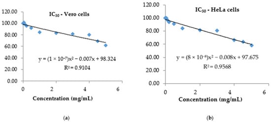 IC50 calculated after exposure of Vero (a)/HeLa (b) cell cultures to P. spinosa crude extract.